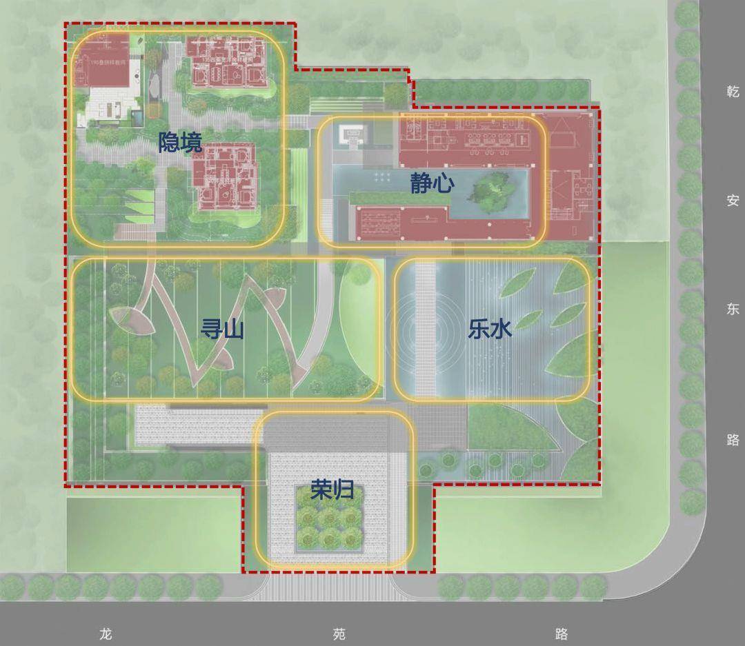 中建宸庐诗画园林示范区,采用景观递进和移步换景的设计手法,通过“荣归—乐水—静心—寻山—隐境”的有机动线,将王维的山水情怀贯穿其间,浓荫之下,屋脊隐现,曲径通幽,移步异景。